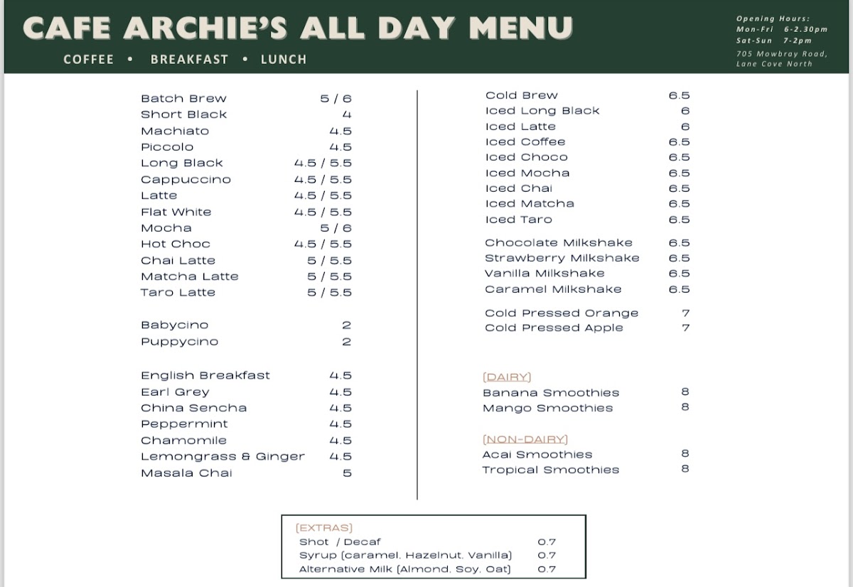 Cafe Archie’s Lane Cove Menu